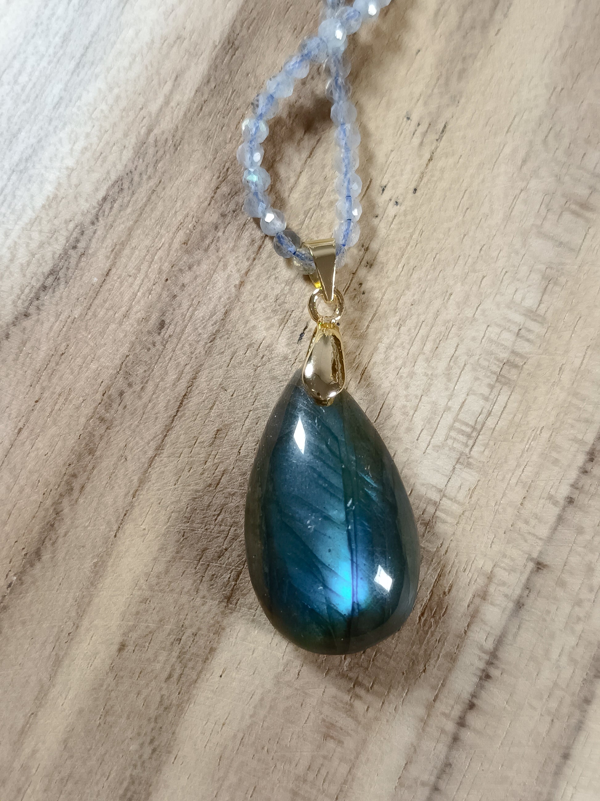 Mystérieux et fascinant, le collier Éclat de Labradorite met en valeur la beauté envoûtante de la labradorite. Ses perles facettées de 2 mm scintillent de reflets irisés, variant du bleu au vert, selon la lumière. Le pendentif en labradorite, pierre de protection par excellence, complète ce bijou unique et puissant.