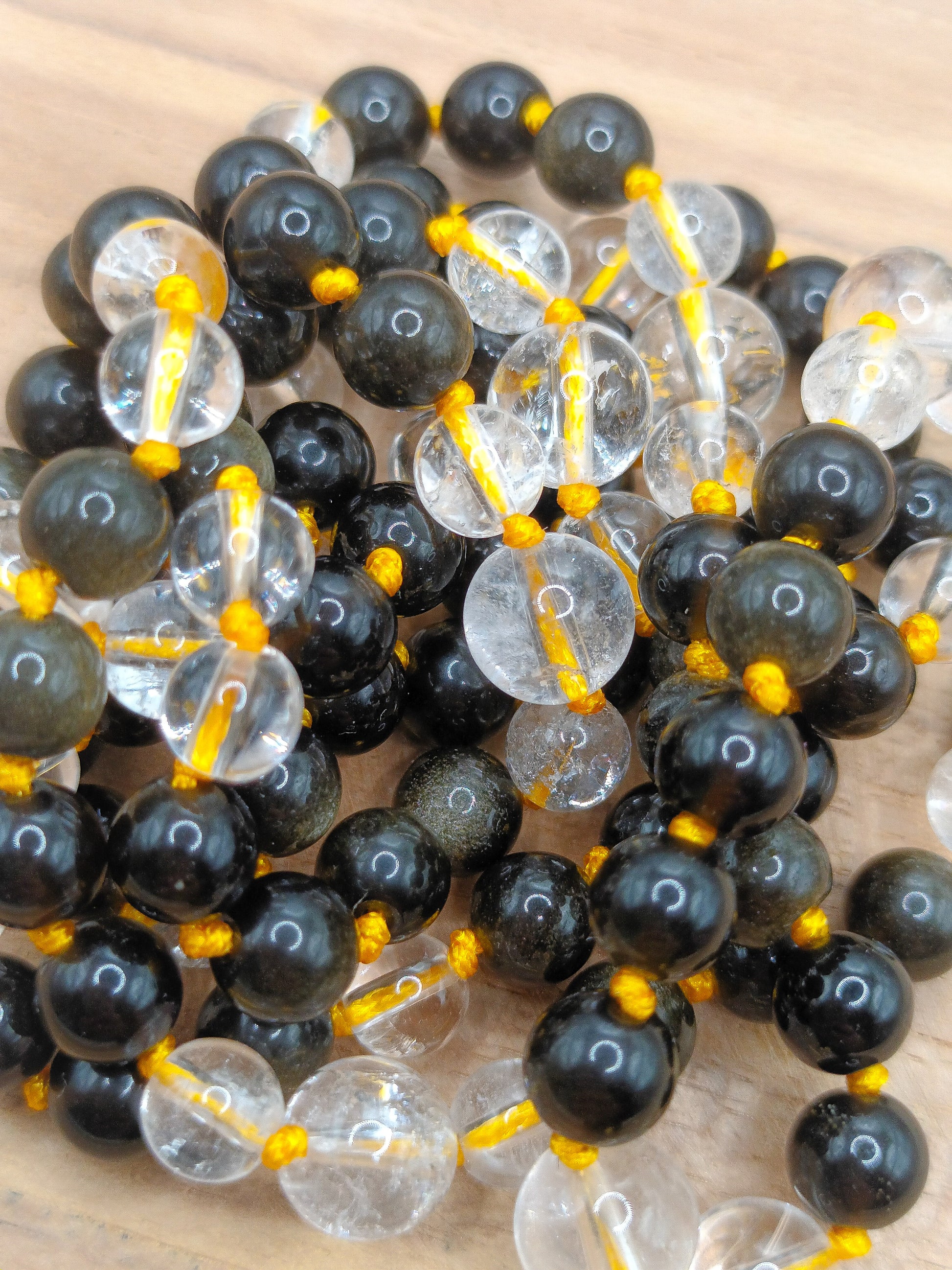 Symbole de lumière et de vérité, le mala Apollon associe la force protectrice de l’obsidienne dorée à la clarté du cristal de roche pour guider vos pas sur le chemin de la conscience et de l’harmonie.