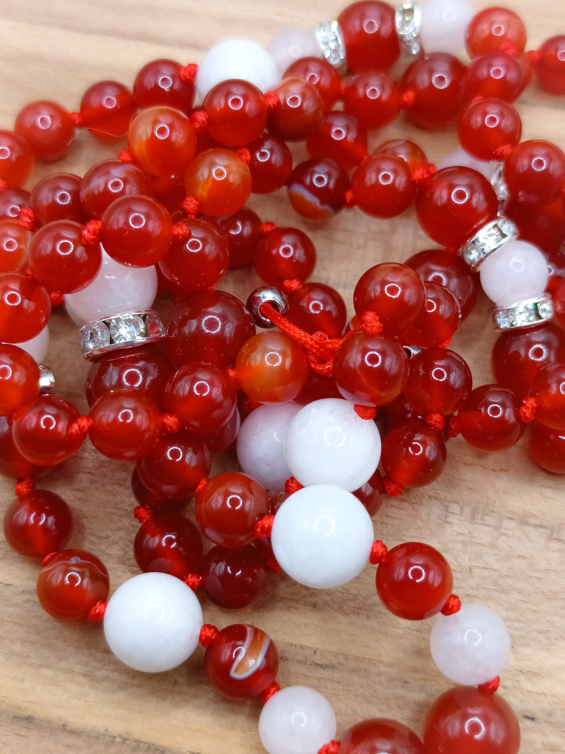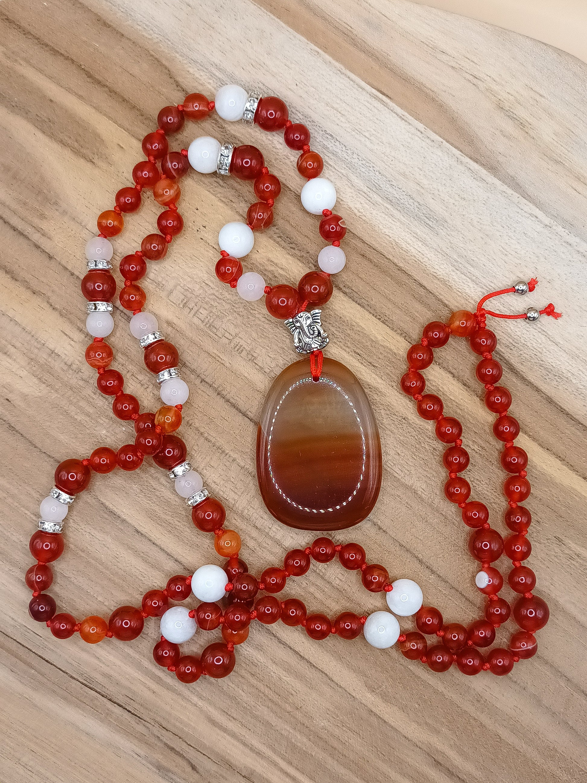 Le mala Ariane est composé de 108 perles en pierres naturelles de cornaline et de pierre de lune blanche, agrémenté d’un pendentif en cornaline. Monté sur un fil nylon résistant et terminé par deux perles en acier inoxydable, il unit solidité et élégance.