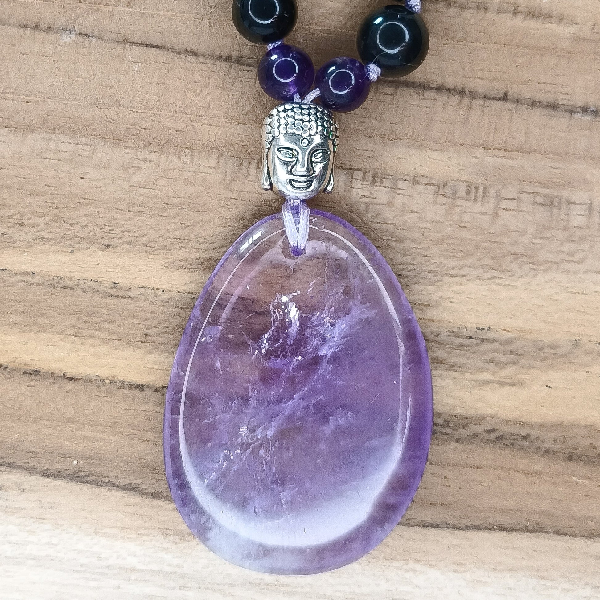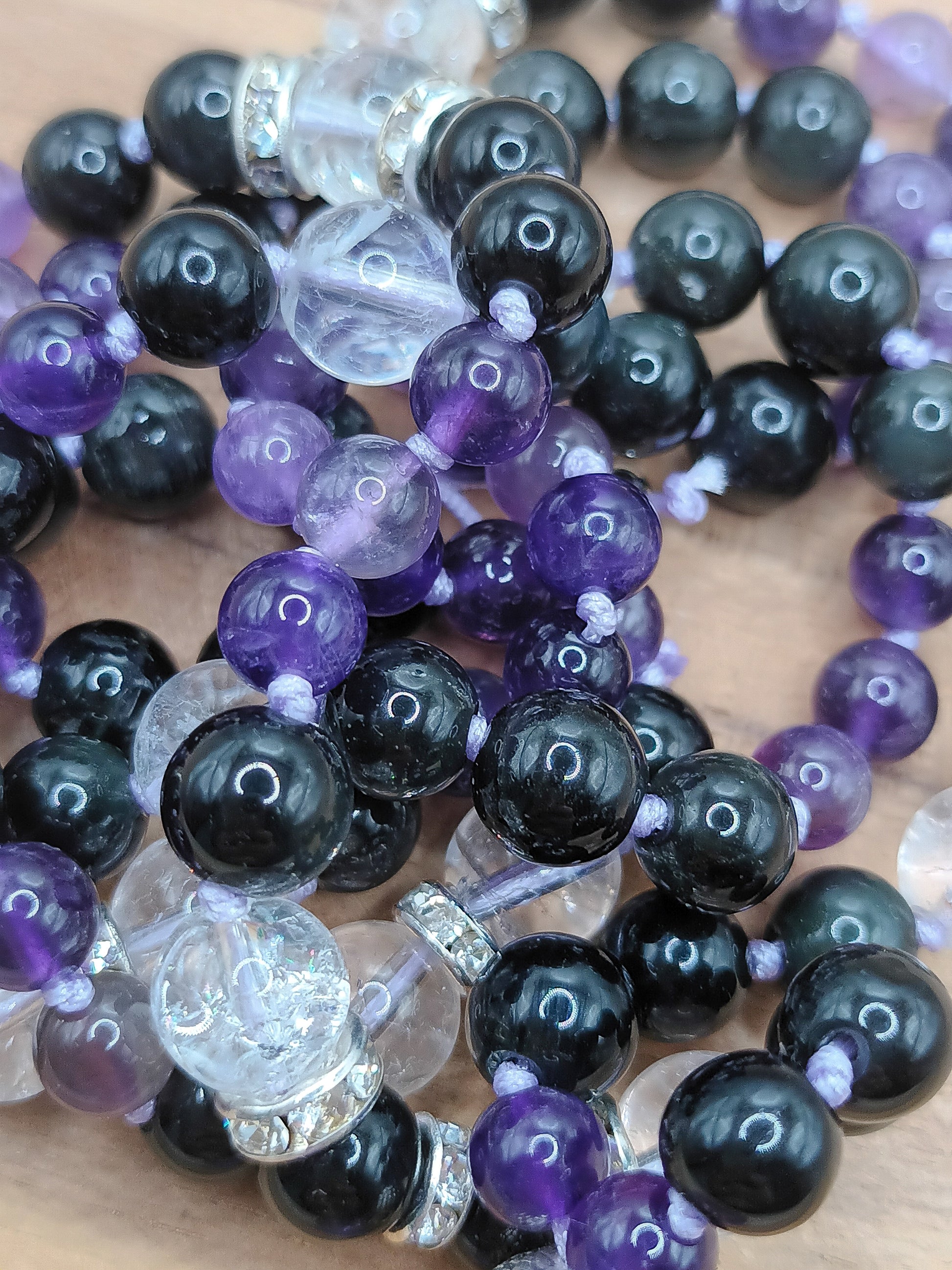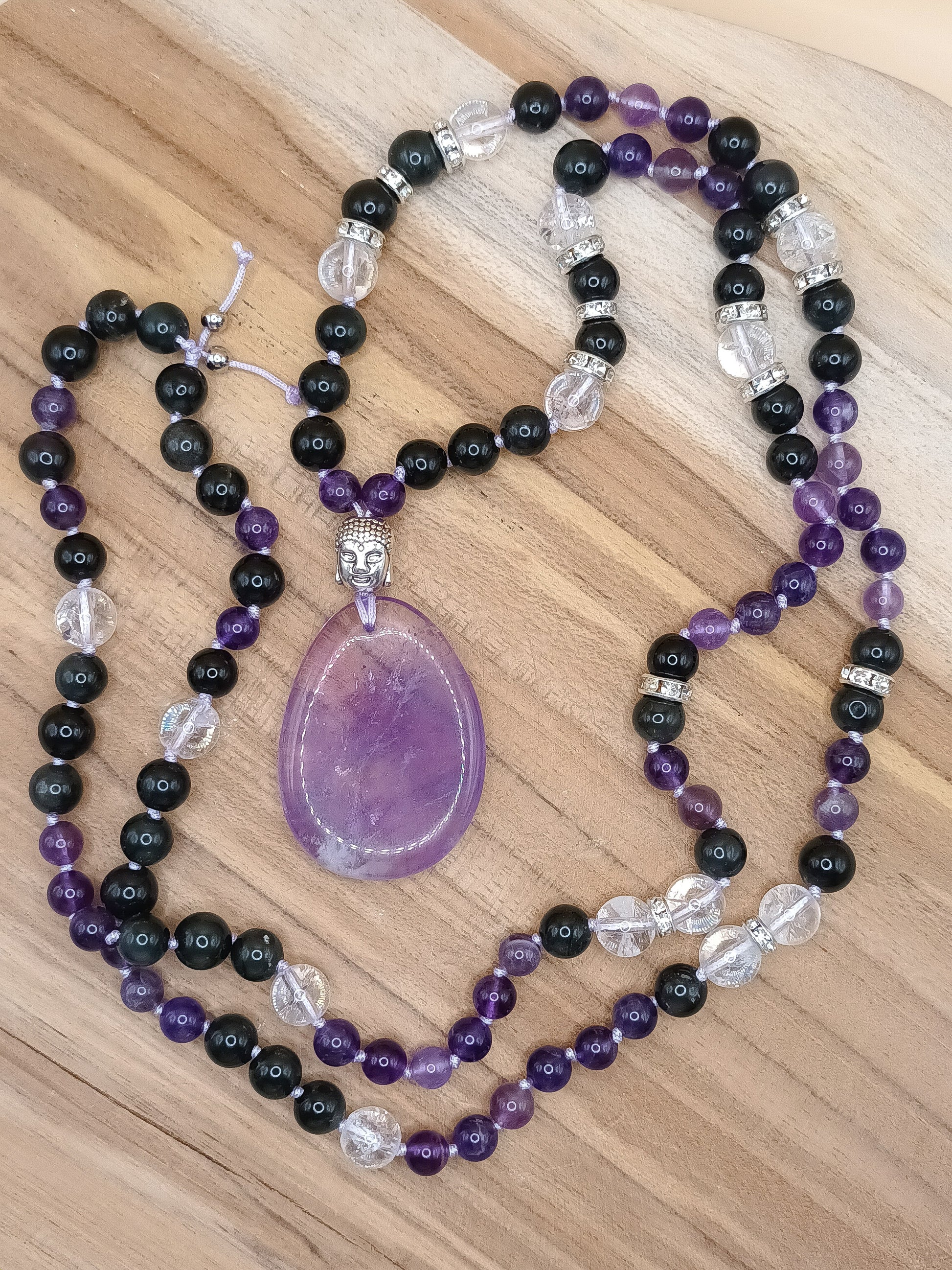 Le mala Astrée est composé de 108 perles en améthyste, obsidienne œil céleste et cristal de roche, agrémenté d’un pendentif en améthyste. Monté sur un fil nylon solide et terminé par deux petites perles en acier inoxydable, il incarne l’harmonie entre protection, clarté et élévation spirituelle.