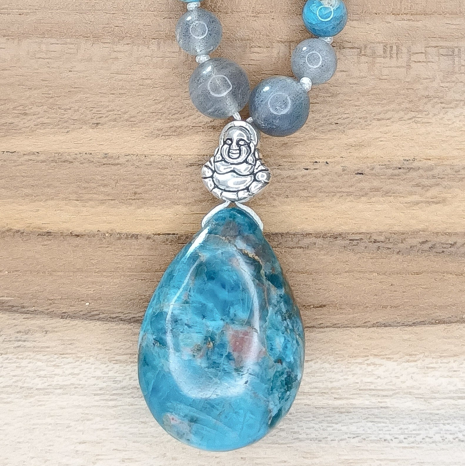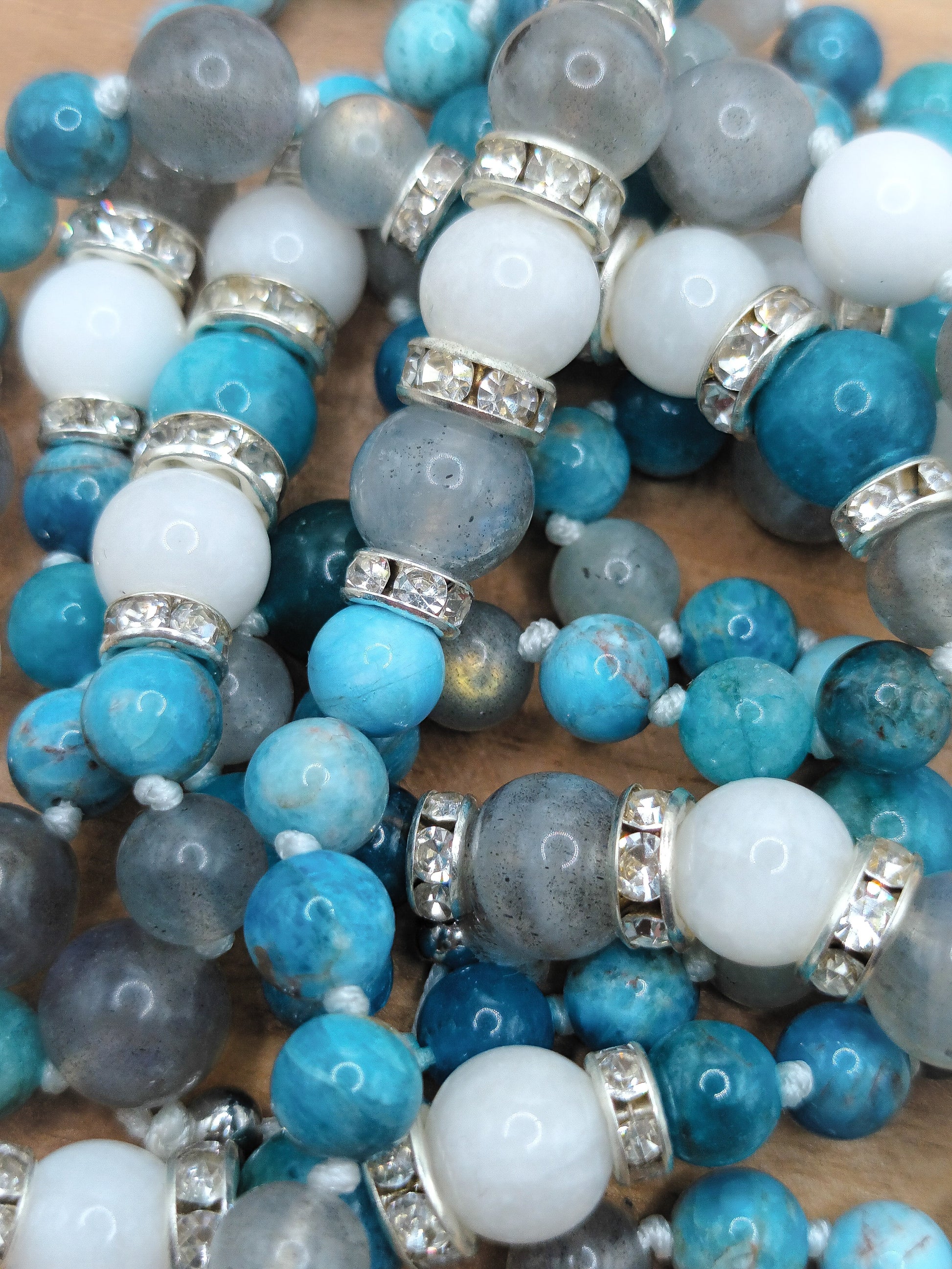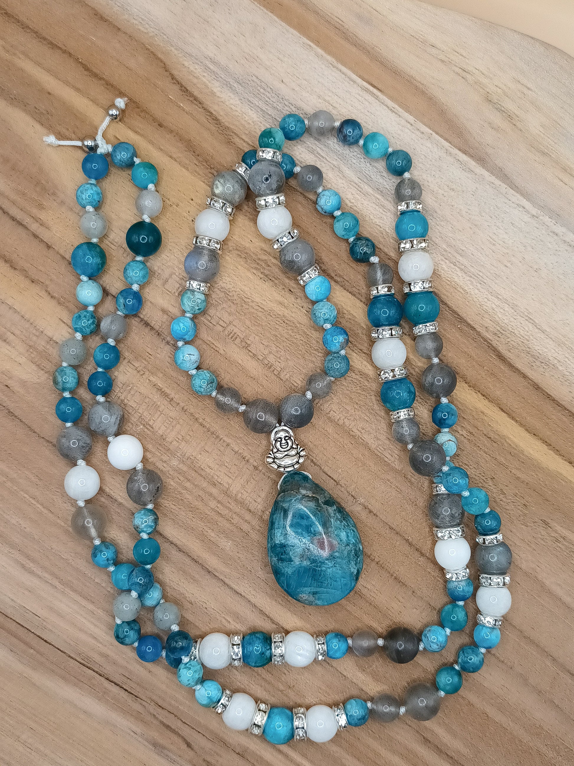 Le mala Cassandre est composé de 108 perles en pierres naturelles : apatite, pierre de lune blanche et labradorite, accompagnées d’un pendentif en apatite. Monté sur un fil nylon solide et terminé par deux perles en acier inoxydable, il est à la fois résistant et élégant.