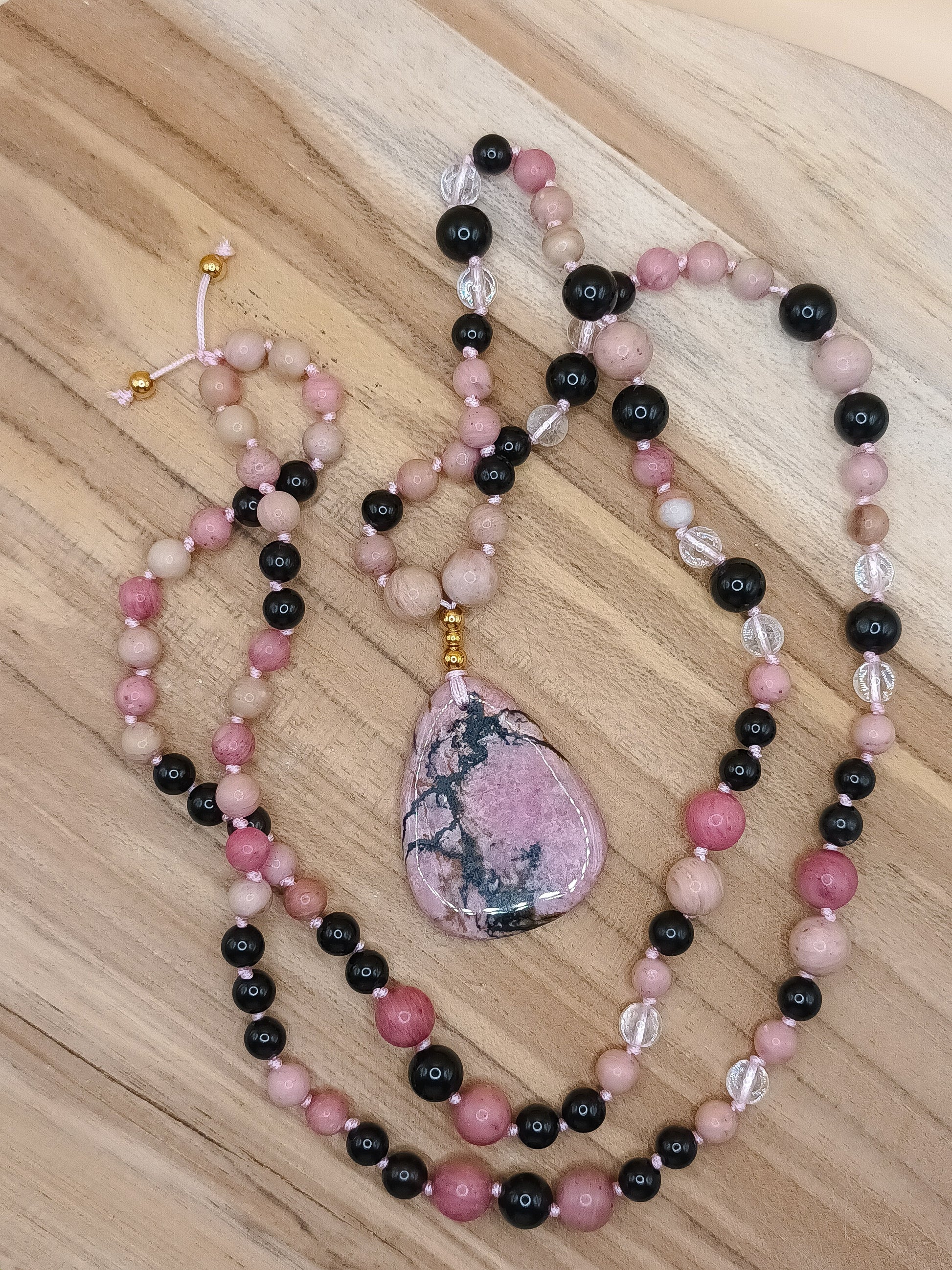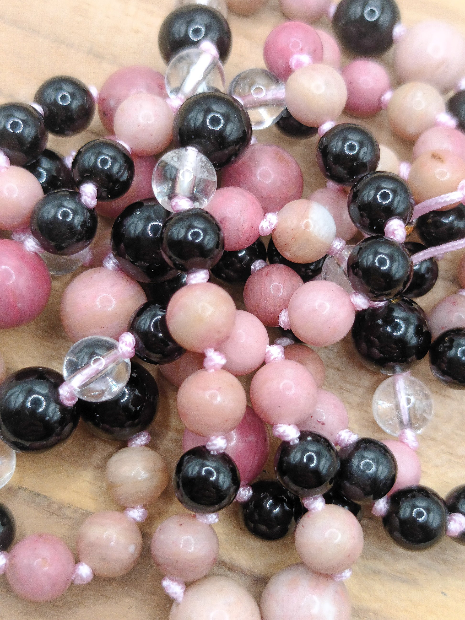Le mala Gaïa est composé de 108 perles en pierres naturelles de rhodonite, obsidienne noire et cristal de roche, agrémenté d’un pendentif en rhodonite. Monté sur un fil nylon solide et terminé par deux petites perles en acier inoxydable, il allie élégance, durabilité et puissance énergétique.