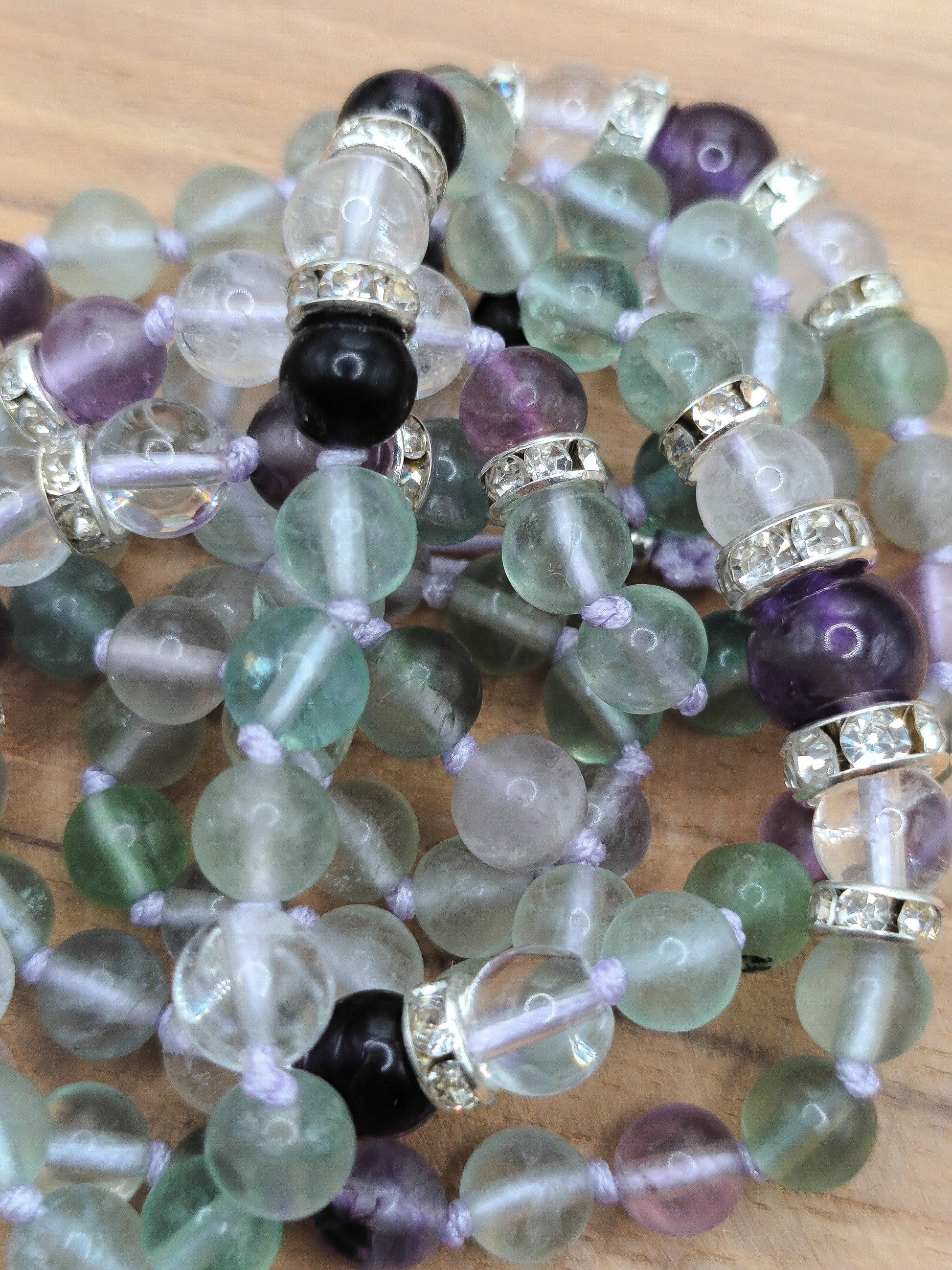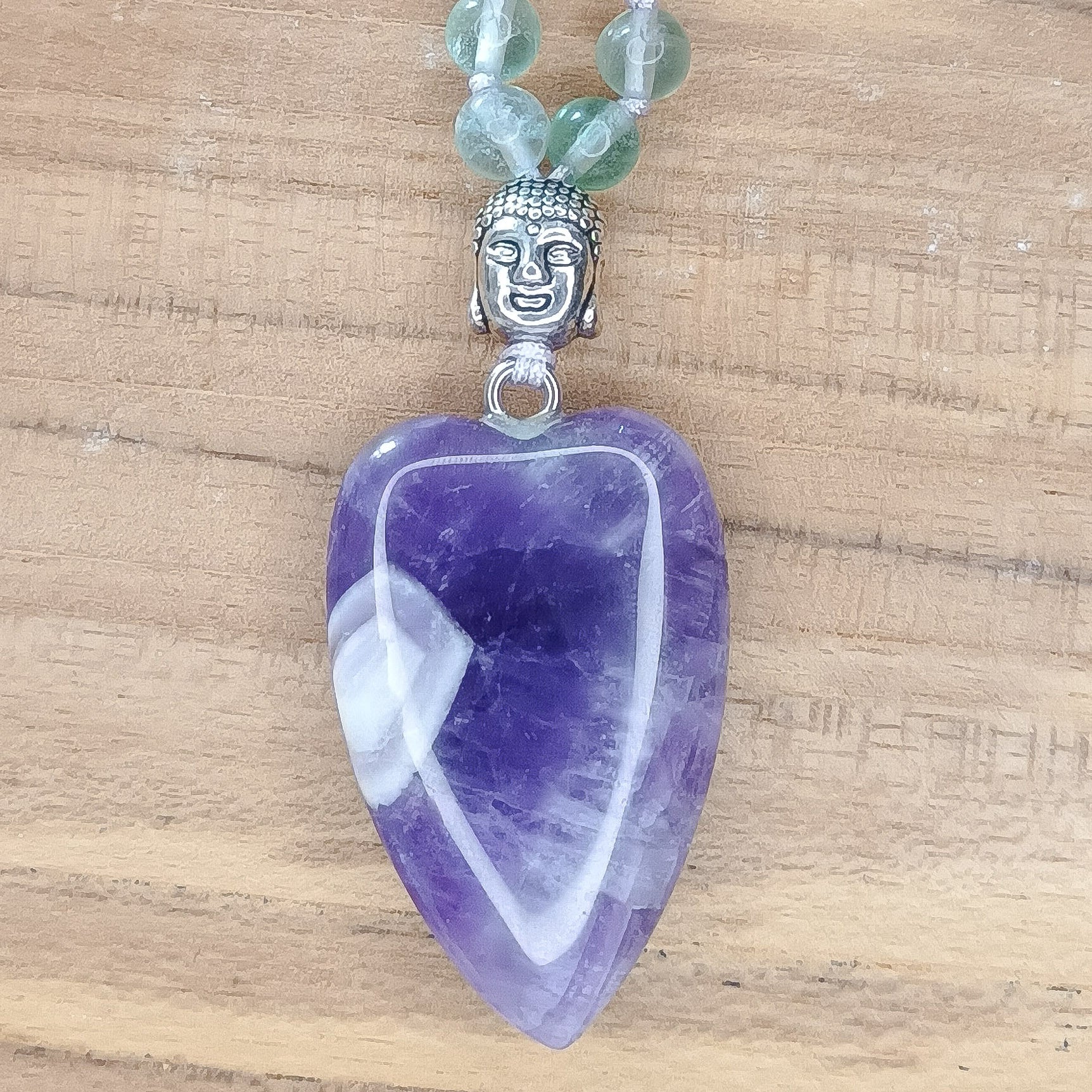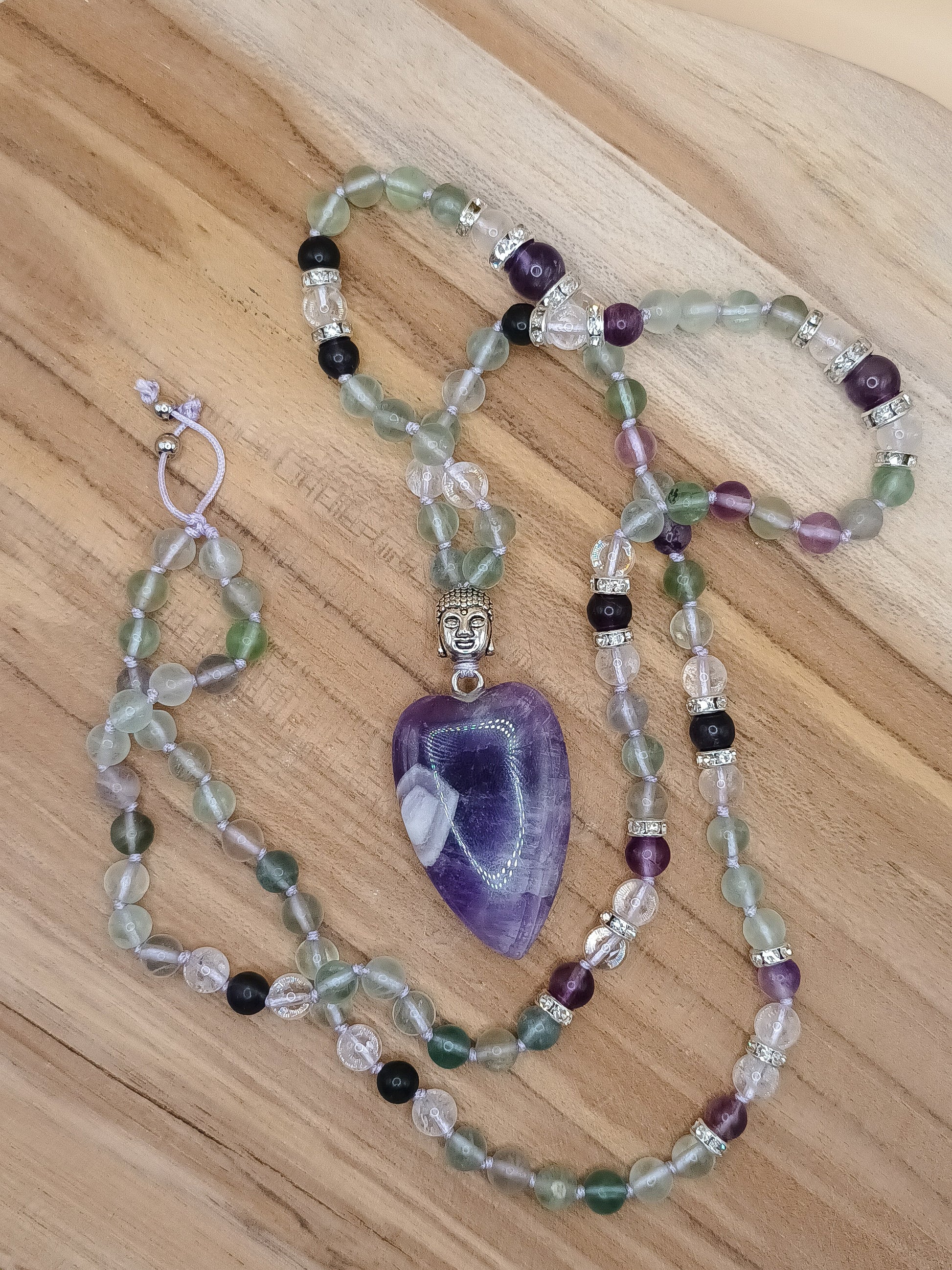 Le mala Léto est composé de 108 perles en pierres naturelles d’améthyste, de fluorite et de cristal de roche, avec un pendentif en améthyste.Monté sur un fil nylon solide et terminé par deux petites perles en acier inoxydable, il unit beauté intemporelle et puissance symbolique.