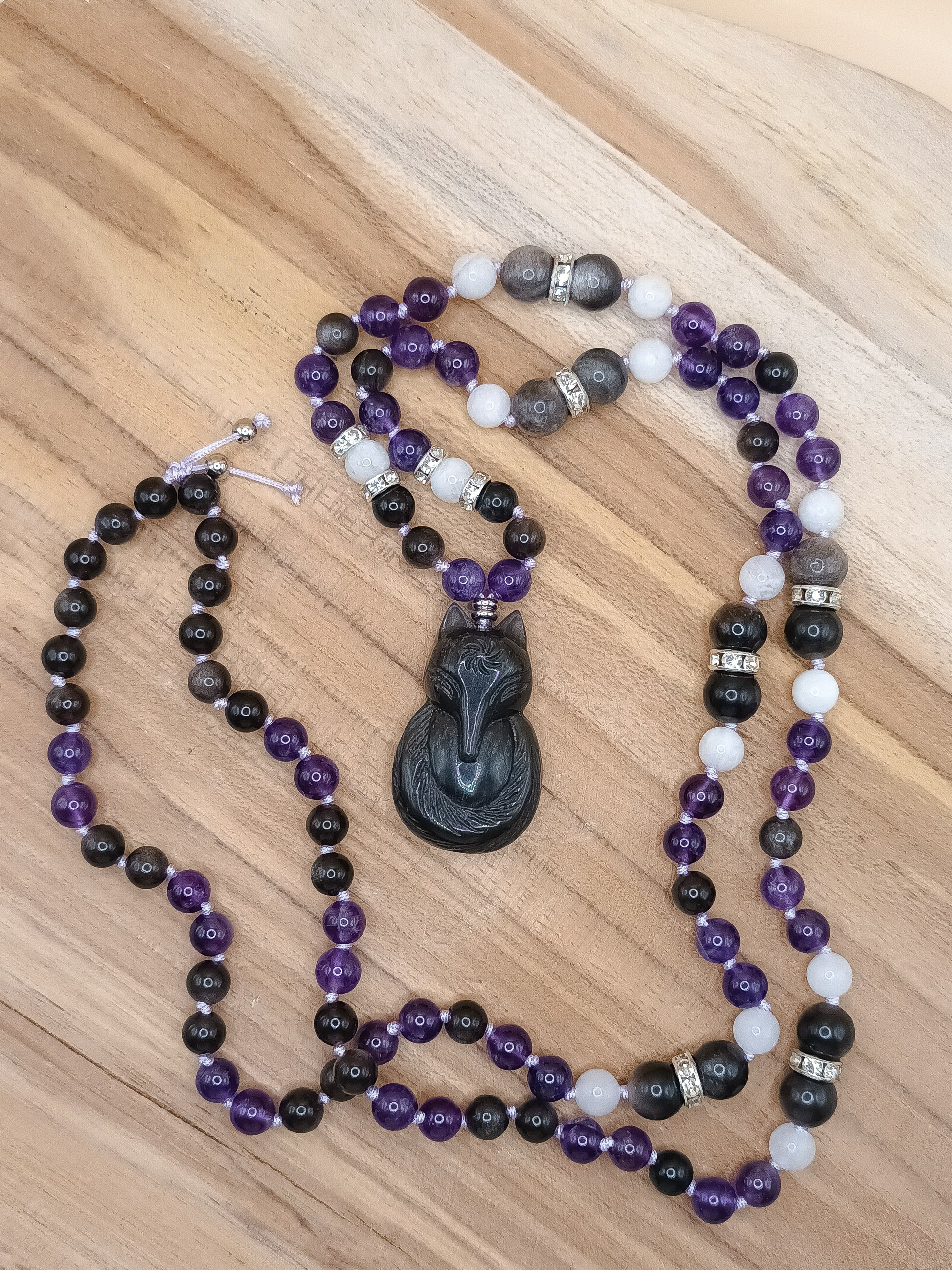 Le mala Mnémosyne est composé de 108 perles en pierres naturelles d’obsidienne argentée, d’améthyste et de pierre de lune blanche, agrémenté d’un pendentif en obsidienne argentée. Monté sur un fil nylon solide et terminé par deux petites perles en acier inoxydable, il combine puissance protectrice, élévation spirituelle et guidance intuitive.