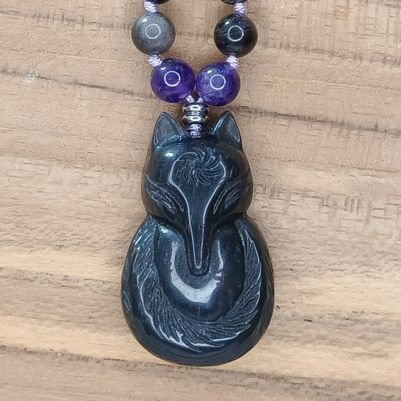 - Pendentif : renard en obsidienne argentée, 3,5 cm