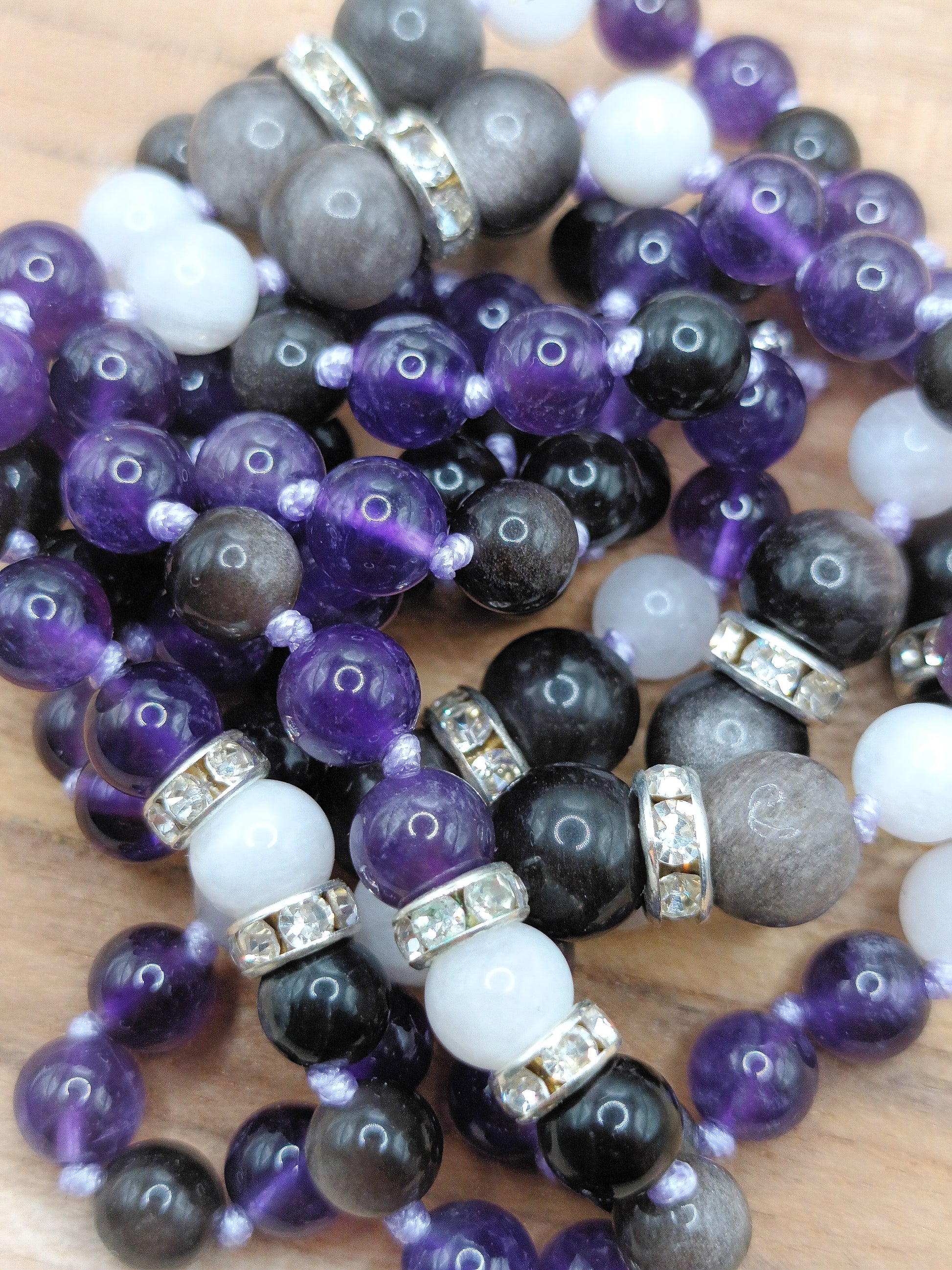 Symbole de Mnémosyne, déesse de la mémoire et mère des Muses, ce mala favorise la clarté d’esprit, la connexion intérieure et la stabilité émotionnelle. L’obsidienne argentée agit comme un miroir protecteur et révélateur de vérité, l’améthyste élève la conscience et apaise le mental, tandis que la pierre de lune blanche ouvre à l’intuition et à la sagesse féminine.